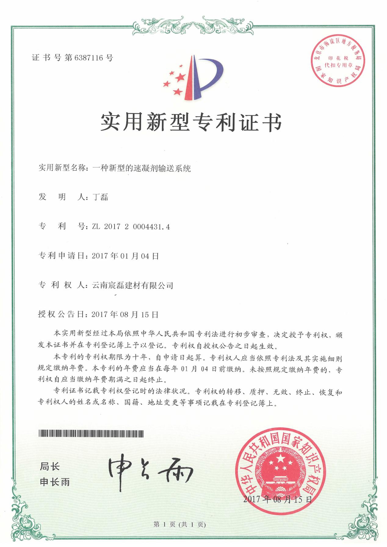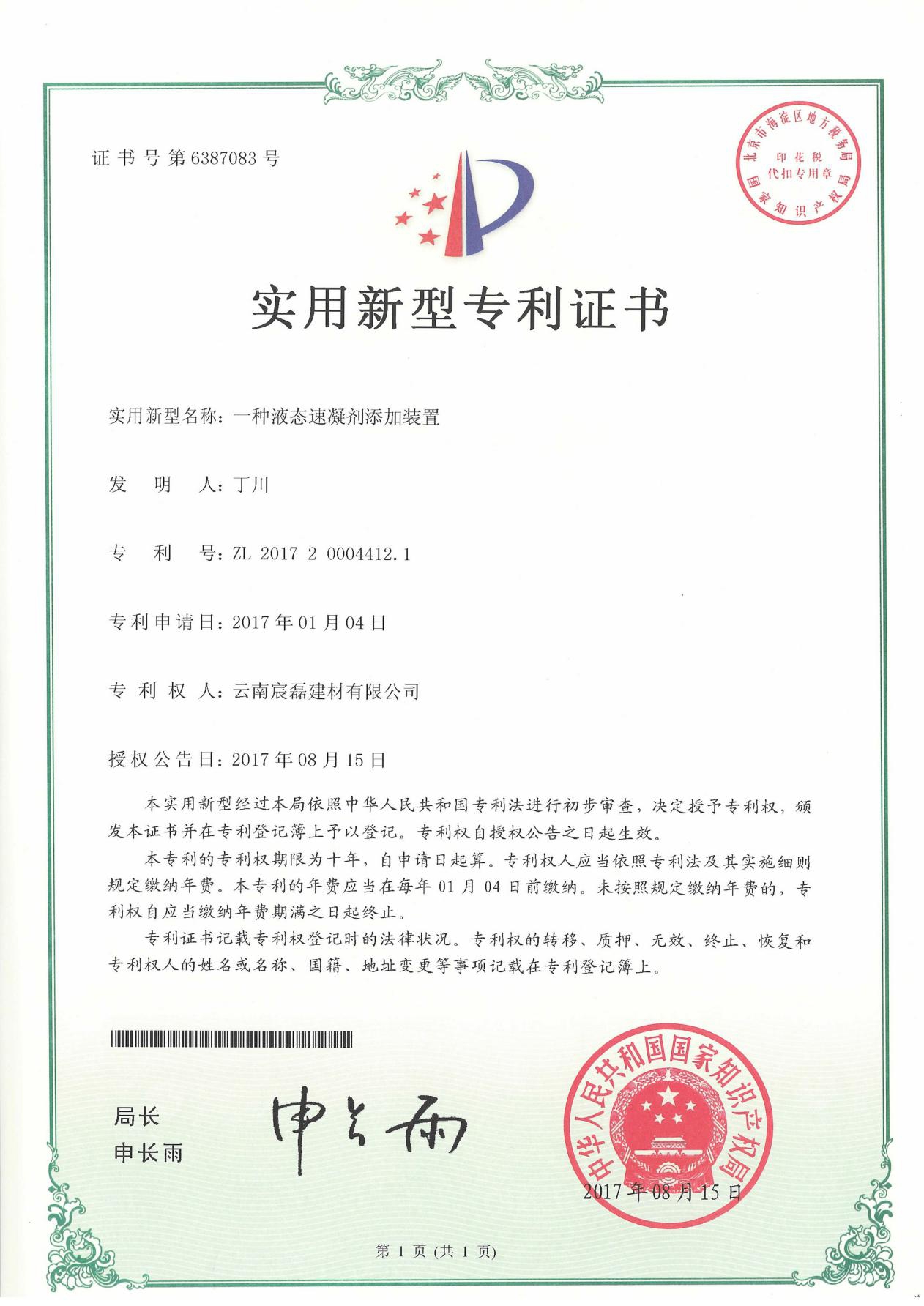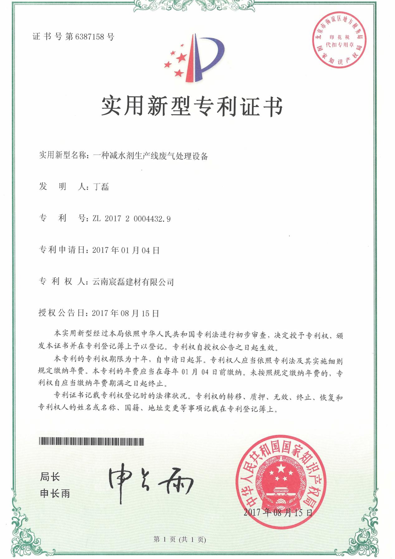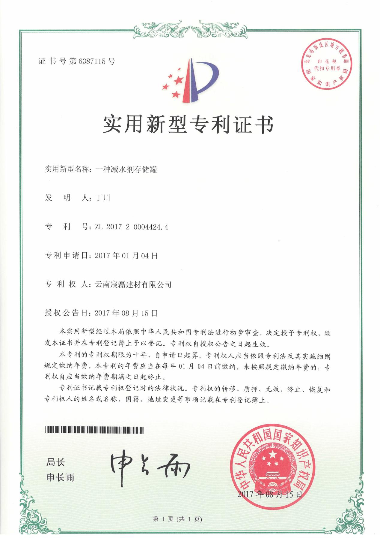 ">2015年成立技術(shù)研發(fā)中心,2017年成功申報(bào)10余項(xiàng)實(shí)用型專利證書。分別是一種搖動(dòng)減水劑、一種用于生產(chǎn)引氣劑的攪拌釜、一種散裝混凝土膨脹劑下料收塵裝置、一種綜合型聚羧酸減水劑及其制備方法、一種液態(tài)速凝劑添加裝置、一種減水劑生產(chǎn)線廢氣處理設(shè)備、一種減水劑存儲(chǔ)罐、一種混凝土多功能防腐劑生產(chǎn)系統(tǒng)、一種高效混凝土膨脹劑的提取系統(tǒng)、一種早強(qiáng)型聚羧酸減水劑及其制備方法、一種減水劑反應(yīng)釜、一種新型的速凝劑輸送系統(tǒng)。